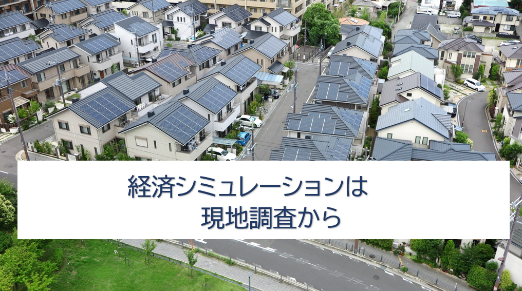 現地調査は、重要です。お見積り、発電シミュレーションもここからがスタートです。発電シミュレーションには、地域・正確な屋根面積・方位・勾配が必要です。ネット業者の中には現地調査はせず屋根図面のみでの発電シミュレーションを作成することも多いようです。屋根図面だけでは正確な方位などはわかりません。ましてや障害物となる建物や電柱の有無もわかりません。スタートとなる時点で、間違った情報をもとに設計することになります。屋根面積等も含め実際に現場をみなければ、正確なお見積りは出せません。現地調査は、1丁目1番地です。経費削減のため、机上で済ませていることがトラブルの原因となっています。実際に工事当日まで一回も屋根に上がってないという例もあります。屋根からはみ出しているパネルもたまに見かけますが、現地調査ぬきの一発工事の可能性が高いです。屋根からパネルがはみ出している場合、メーカー保証対象外ですので、お客様からしたら散々です。まずは、現地調査の上で正確な情報をもとに発電シミュレーションを作成しないといけません。スタートの発電シミュレーションが間違っていれば、その後の経済シミュレーションも意味をなしません。